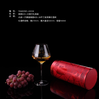 编号:TBWBZ001-42038 品名:丽固420-38单只礼品装 品牌:TBW礼盒 类型:TBW礼盒 系列:德国丽固系列 规格: 包装:内含一只德国丽固420-38手工勃艮第红酒杯。红酒杯规格:高 270mm,最大直径 126mm,容量960ml